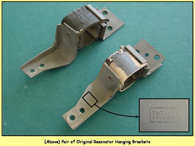 Resonator Hanging Bracket - All dual-exhaust Mustangs from 1967 - 1969 use the same resonator hanging bracket. Two brackets are required per car; one for the passenger side and one for the driver side. The two brackets are not identical, they are mirror images of each other, there is a left and a right bracket. The lower portion of the bracket attaches to the resonator bracket (welded to the resonator or pipe depending on application) with two bolts. The top portion of the bracket attaches to the floor of the car. And the top and bottom portions are secured together with a piece of rubber (tire sidewall) and two flat-head, semi-tubular rivets with backing plates. The metal parts are natural and not plated. The bottom metal portion of the bracket is nearly always stamped FoMoCo in a rectangle...although some originals escaped the stamping process. See Pictures below.